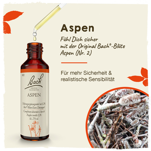 Wenn Sie sich leicht ängstlich und nervös fühlen, ist ASPEN gut für Sie geeignet. Die Original Bach®-Blüten-Einzelessenzen im traditionellen 20ml Fläschchen.