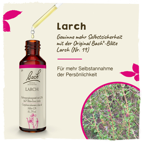 Wenn Sie eine neue Aufgabe gern mit mehr Selbstvertrauen angehen möchten, ist LARCH gut für Sie geeignet. Die Original Bach®-Blüten-Einzelessenzen im traditionellen 20ml Fläschchen.