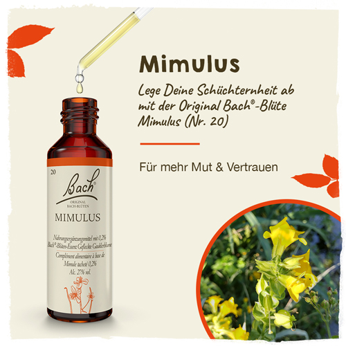 Wenn Ihnen eine bevorstehende Situation, wie z.B. ein Zahnarztbesuch, eine Flugreise oder vor Publikum zu sprechen, Sorgen bereitet, ist MIMULUS gut für Sie geeignet. Die Original Bach®-Blüten-Einzelessenzen im traditionellen 20ml Fläschchen.