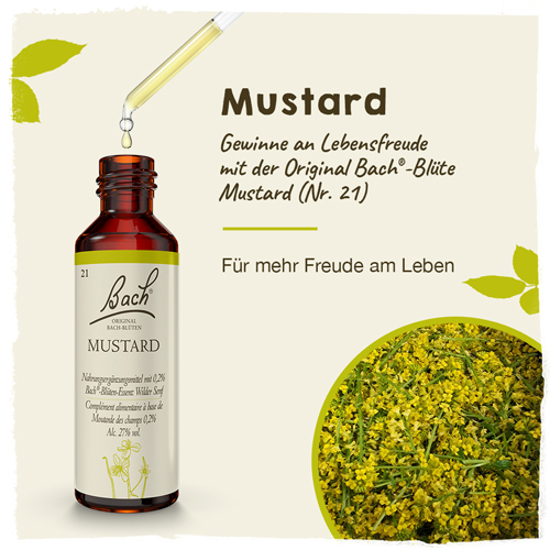 Wenn Sie sich manchmal bekümmert fühlen, ohne genau zu wissen warum, ist MUSTARD gut für Sie geeignet. Die Original Bach®-Blüten-Einzelessenzen im traditionellen 20ml Fläschchen.