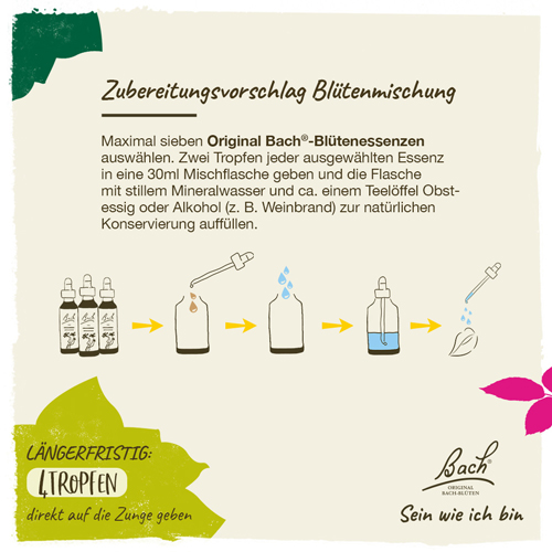 2 Tropfen in ein Glas Wasser geben und schluckweise trinken. Oder 2 Tropfen in ein Fläschchen mit 30ml stillem Mineralwasser geben und mehrmals täglich 4 Tropfen davon nehmen.