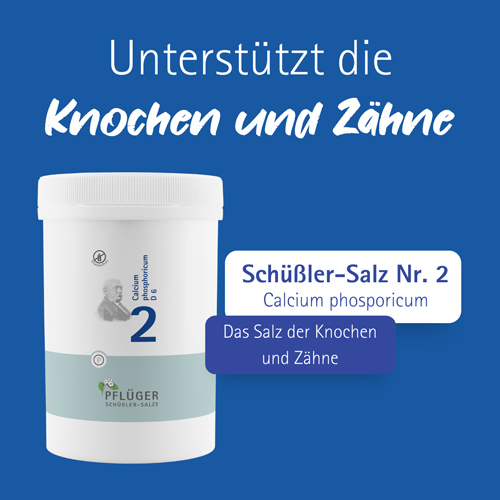 Egal in welchem Alter! Immer dann, wenn es um unsere Knochen und Zähne geht: Schüßler-Salz Nr. 2 Calcium phosphoricum von Pflüger. Calcium phosphoricum kommt in unserem Körper in allen Zellen vor und ist Hauptbestandteil der Knochen und Zähne.