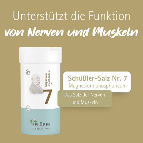 Biochemie Pflüger® Nr. 7 Magnesium phosphoricum D6, Zusammensetzung: 1 Tablette enthält: Wirkstoff: Magnesium phosphoricum Trit. D6 250 mg. Sonstige Bestandteile: Calciumbehenat (DAB), Kartoffelstärke. Registriertes homöopathisches Arzneimittel, daher ohne Angabe einer therapeutischen Indikation. Gegenanzeigen/Nebenwirkungen: keine bekannt. Enthält Lactose. Packungsbeilage beachten. Zu Risiken und Nebenwirkungen lesen Sie die Packungsbeilage und fragen Sie Ihre Ärztin, Ihren Arzt oder in Ihrer Apotheke. Homöopathisches Laboratorium Alexander Pflüger GmbH & Co. KG · 33378 Rheda-Wiedenbrück · info@pflueger.de · www.pflueger.de
