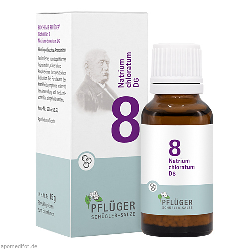 Biochemie Pflüger® Globuli Nr. 8 Natrium chloratum D6, Zusammensetzung: In 10 g Streukügelchen sind verarbeitet: Wirkstoff Natrium chloratum Dil. D6 0,1 g. Registriertes homöopathisches Arzneimittel, daher ohne Angabe einer therapeutischen Indikation. Gegenanzeigen/Nebenwirkungen: keine bekannt. Enthält Sucrose. Packungsbeilage beachten. Zu Risiken und Nebenwirkungen lesen Sie die Packungsbeilage und fragen Sie Ihre Ärztin, Ihren Arzt oder in Ihrer Apotheke.