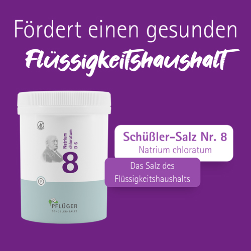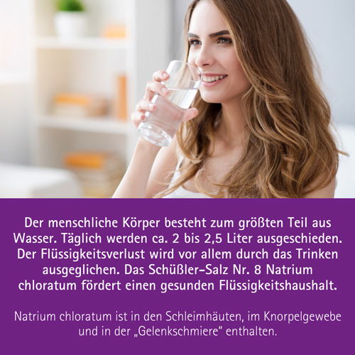 Der menschliche Körper besteht zum größten Teil aus Wasser. Täglich werden ca. 2 bis 2,5 Liter ausgeschieden. Der Flüssigkeitsverlust wird vor allem durch das Trinken ausgeglichen. Das Schüßler-Salz Nr. 8 Natrium chloratum von Pflüger fördert einen gesunden Flüssigkeitshaushalt.