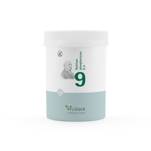 Biochemie Pflüger® Nr. 9 Natrium phosphoricum D6, Zusammensetzung: 1 Tablette enthält: Wirkstoff: Natrium phosphoricum Trit. D6 250 mg. Sonstige Bestandteile: Calciumbehenat (DAB), Kartoffelstärke. Registriertes homöopathisches Arzneimittel, daher ohne Angabe einer therapeutischen Indikation. Gegenanzeigen/Nebenwirkungen: keine bekannt. Enthält Lactose. Packungsbeilage beachten. Zu Risiken und Nebenwirkungen lesen Sie die Packungsbeilage und fragen Sie Ihre Ärztin, Ihren Arzt oder in Ihrer Apotheke. Homöopathisches Laboratorium Alexander Pflüger GmbH & Co. KG · 33378 Rheda-Wiedenbrück · info@pflueger.de · www.pflueger.de