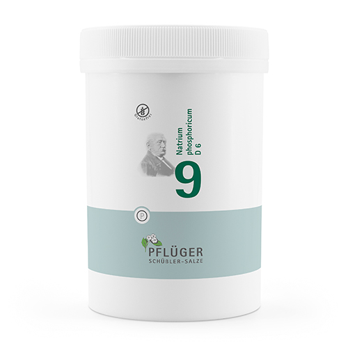 Biochemie Pflüger® Nr. 9 Natrium phosphoricum D6, Zusammensetzung: 1 Tablette enthält: Wirkstoff: Natrium phosphoricum Trit. D6 250 mg. Sonstige Bestandteile: Calciumbehenat (DAB), Kartoffelstärke. Registriertes homöopathisches Arzneimittel, daher ohne Angabe einer therapeutischen Indikation. Gegenanzeigen/Nebenwirkungen: keine bekannt. Enthält Lactose. Packungsbeilage beachten. Zu Risiken und Nebenwirkungen lesen Sie die Packungsbeilage und fragen Sie Ihre Ärztin, Ihren Arzt oder in Ihrer Apotheke. Homöopathisches Laboratorium Alexander Pflüger GmbH & Co. KG · 33378 Rheda-Wiedenbrück · info@pflueger.de · www.pflueger.de