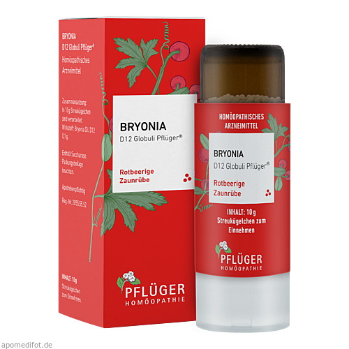 Bryonia D12 Globuli Pflüger®, Zusammensetzung: In 10 g Streukügelchen sind verarbeitet: Wirkstoff: Bryonia Dil. D12 0,1 g. Sonstiger Bestandteil: Saccharose. Registriertes homöopathisches Arzneimittel, daher ohne Angabe einer therapeutischen Indikation. Gegenanzeigen / Nebenwirkungen: Keine bekannt. Enthält Saccharose. Packungsbeilage beachten. Zu Risiken und Nebenwirkungen lesen Sie die Packungsbeilage und fragen Sie Ihre Ärztin, Ihren Arzt oder in Ihrer Apotheke. Homöopathisches Laboratorium Alexander Pflüger GmbH & Co. KG 33378 Rheda-Wiedenbrück info@pflueger.de www.pflueger.de