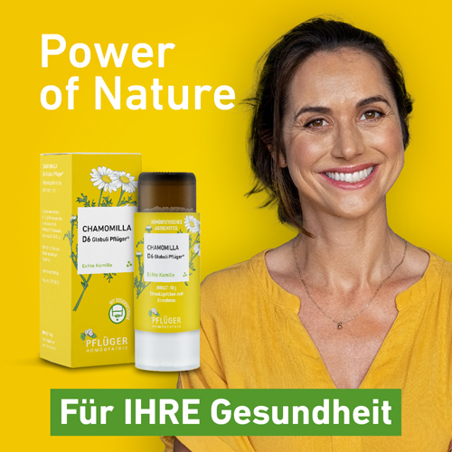 Chamomilla D6 Globuli Pflüger®, Zusammensetzung: In 10 g Streukügelchen sind verarbeitet: Wirkstoff: Chamomilla recutita Dil. D6 0,1 g. Sonstiger Bestandteil: Saccharose. Registriertes homöopathisches Arzneimittel, daher ohne Angabe einer therapeutischen Indikation. Gegenanzeigen / Nebenwirkungen: Keine bekannt. Enthält Saccharose. Packungsbeilage beachten. Zu Risiken und Nebenwirkungen lesen Sie die Packungsbeilage und fragen Sie Ihre Ärztin, Ihren Arzt oder in Ihrer Apotheke. Homöopathisches Laboratorium Alexander Pflüger GmbH & Co. KG 33378 Rheda-Wiedenbrück info@pflueger.de www.pflueger.de