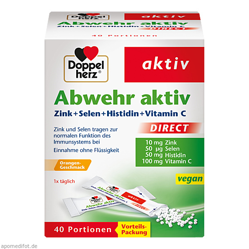 Durch ein modernes Herstellungsverfahren ist es gelungen, eine moderne und praktische Darreichungsform zu entwickeln. Doppelherz Abwehr aktiv DIRECT enthält seine wertvollen Nährstoffe in Form von Micro-Pellets. Den Portionsbeutel aufreißen, den Inhalt direkt auf die Zunge geben und die feinen Granulatperlen lösen sich in Sekundenschnelle auf. Sie können so jederzeit und an jedem Ort ganz ohne Flüssigkeit geschluckt werden. Diese Darreichungsform ist daher besonders gut geeignet, um den Körper schnell und direkt mit den Spurenelementen Zink und Selen sowie dem Eiweißbaustein Histidin zu versorgen – ideal für unterwegs oder bei Einnahmeschwierigkeiten von Tabletten.