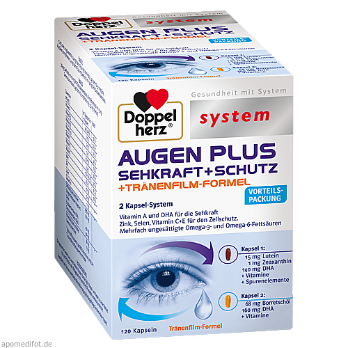 Seefischöl 49,9 %, Gelatine, Feuchthaltemittel Glycerin und Sorbit, lutein- und zeaxanthinhaltiges Konzentrat aus Studentenblumen 6,5 %, Emulgator Mono- und Diglyceride von Speisefettsäuren und Sojalecithine, pflanzliche Öle (Distel, Sonnenblumen), L-Ascorbinsäure, Zinkoxid, Stärke, D-alpha-Tocopherol, Pyridoxinhydrochlorid, Farbstoff Eisenoxide und Eisenhydroxide, Retinylpalmitat, Natriumselenit, Cyanocobalamin