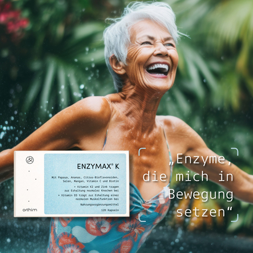 ENZYMAX® K enthält die Enzyme Bromelain, Papain sowie einen Sojabohnenextrakt mit dem Enzym Nattokinase. Zusammen mit Biotin, Vitamin K, Vitamin D sowie Selen, Zink und Citrus-Bioflavonoiden ist diese einzigartige Kombination optimal dazu geeignet, Regenerationsprozesse von Muskeln und Gelenken zu unterstützen und zu beschleunigen und die Zellen vor oxidativem Stress zu schützen.