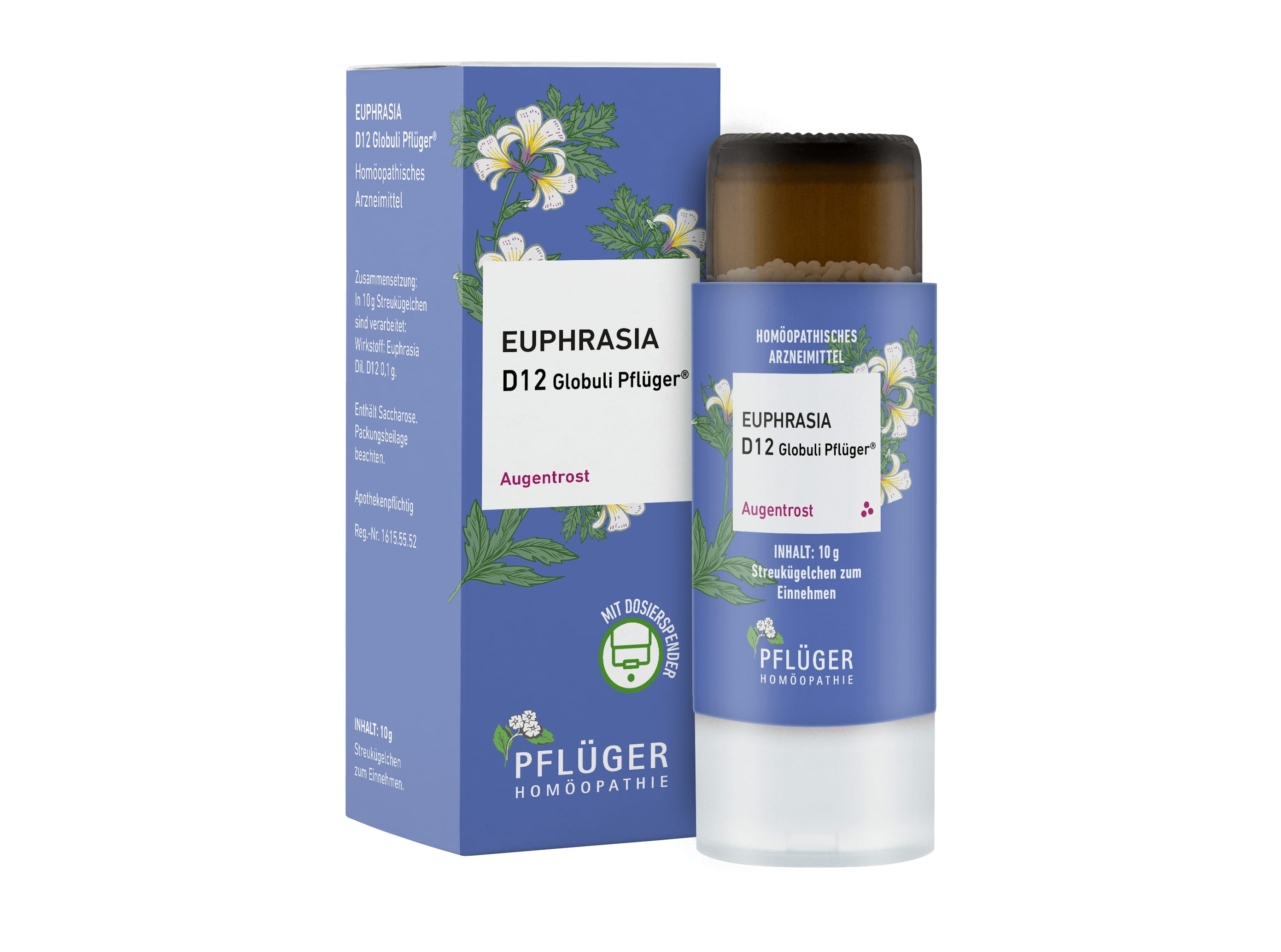 Euphrasia D12 Globuli Pflüger®, Zusammensetzung: In 10 g Streukügelchen sind verarbeitet: Wirkstoff: Euphrasia Dil. D12 0,1 g. Sonstiger Bestandteil: Saccharose. Registriertes homöopathisches Arzneimittel, daher ohne Angabe einer therapeutischen Indikation. Gegenanzeigen / Nebenwirkungen: Keine bekannt. Enthält Saccharose. Packungsbeilage beachten. Zu Risiken und Nebenwirkungen lesen Sie die Packungsbeilage und fragen Sie Ihre Ärztin, Ihren Arzt oder in Ihrer Apotheke. Homöopathisches Laboratorium Alexander Pflüger GmbH & Co. KG 33378 Rheda-Wiedenbrück info@pflueger.de www.pflueger.de