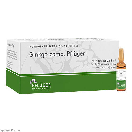 Ginkgo comp. Pflüger. Zusammensetzung: 1 Ampulle zu 2 ml enthält: Wirkstoffe: Ambra grisea Dil. D6 0,1 ml, Anamirta cocculus Dil. D6 0,1 ml, Conium maculatum Dil. D7 0,1 ml, Ginkgo biloba Dil. D6 0,036 ml, Panax ginseng Dil. D6 0,1 ml, Petroleum rectificatum Dil. D8 0,1 ml. Bestandteile 1-6 über die letzten beiden Stufen gemeinsam potenziert. Sonstige Bestandteile: Natriumchlorid, Wasser für Injektionszwecke. Registriertes homöopathisches Arzneimittel, daher ohne Angabe einer therapeutischen Indikation. Gegenanzeigen: Überempfindlichkeit gegen Ginkgo biloba. Bei Kindern unter 12 Jahren nicht anwenden. Nebenwirkungen: Keine bekannt. Zu Risiken und Nebenwirkungen lesen Sie die Packungsbeilage und fragen Sie Ihre Ärztin, Ihren Arzt oder in Ihrer Apotheke. Homöopathisches Laboratorium Alexander Pflüger GmbH & Co. KG 33378 Rheda-Wiedenbrück∙ info@pflueger.de www.pflueger.de