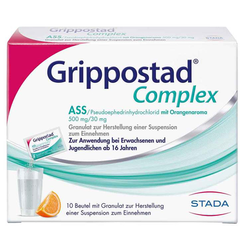 einhergehenden, erkältungsbedingten Schmerzen und Fieber in Folge eines grippalen Infekts. Das Trinkgranulat enthält pro Beutel 500 mg Acetylsalicylsäure und 30 mg Pseudoephedrinhydrochlorid. Grippostad Complex ermöglicht schnell wieder frei durchzuatmen und hat keine dämpfende Wirkung - man bleibt wach und aktiv trotz Erkältung.
