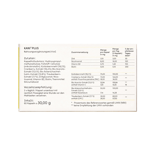 KANI® PLUS ist ein Nahrungsergänzungsmittel zum Erhalt normaler Schleimhaut der Blase** mit der einzigartigen Zusammensetzung aus Cranberry, Kürbiskernmehl, Bio-Ackerschachtelhalm-Extrakt, Traubenkernen, Bio-Acerola, Riboflavin, Niacin und Zink.