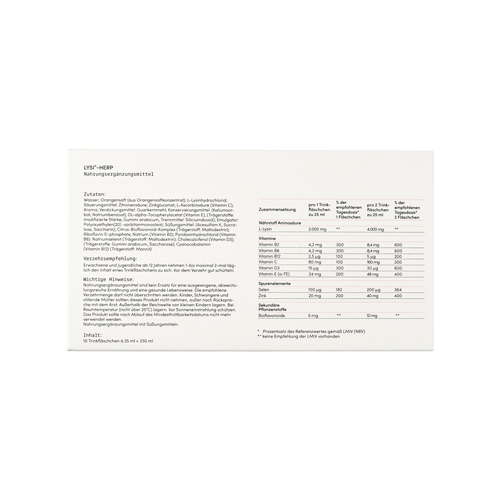 NAHRUNGSERGÄNZUNG – Trinkampulle mit hochdosiertem L-Lysin (2000 mg pro Trinkampulle), Zink, Bioflavonoiden, Selen, Vitamin D3, Vitamin C, Vitamin B12, B6, B2